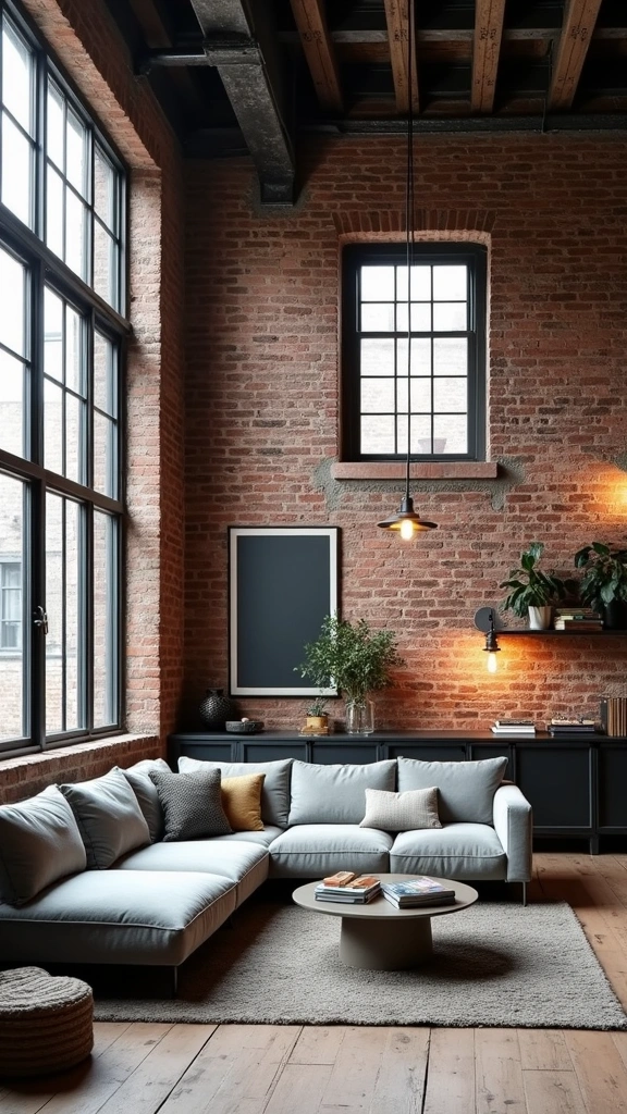 Exposed brick walls, metal beams, and concrete floors create a rugged backdrop, while elegant furnishings soften the space.