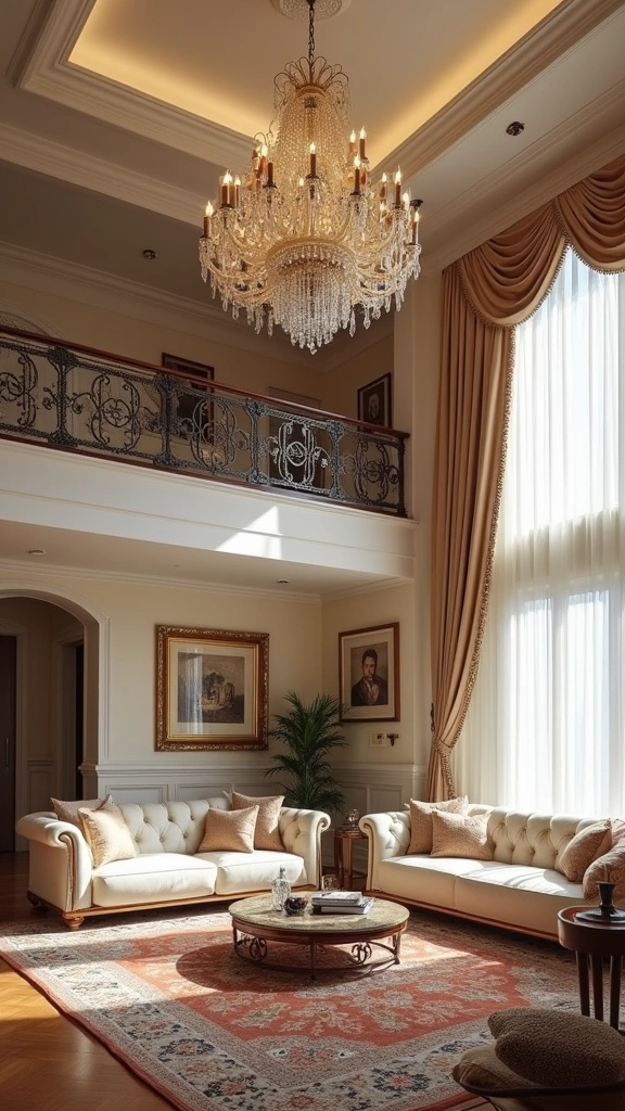 Soft rugs, plush sofas, and elegant drapery add depth and warmth, making the space feel welcoming and opulent.