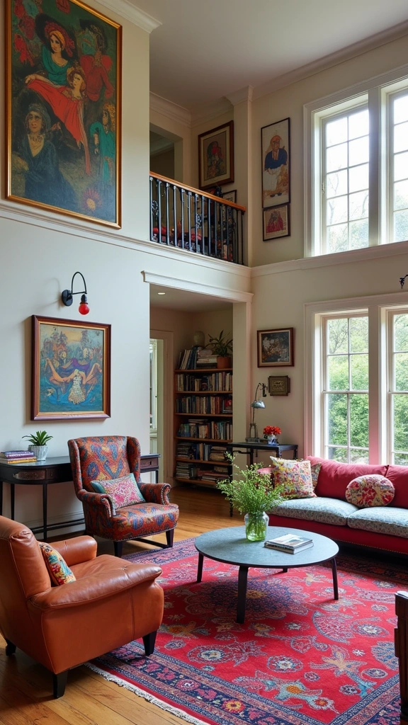 An eclectic double height living room celebrates diversity and creativity by blending various design styles.