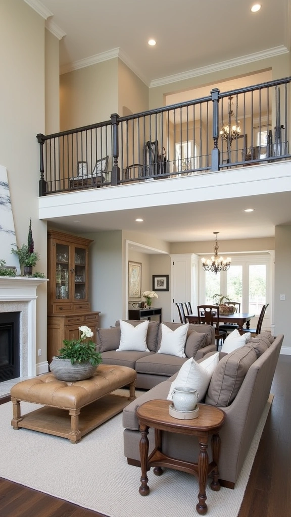 Transitional design in a double height living room merges traditional and contemporary elements for a timeless appeal.