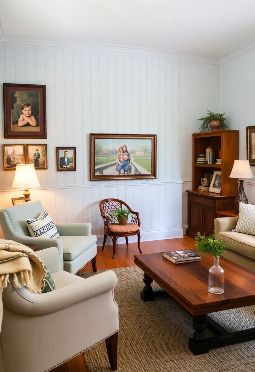 Vintage chic wainscoting brings a nostalgic charm to your living room, perfect for creating a cozy, inviting atmosphere.