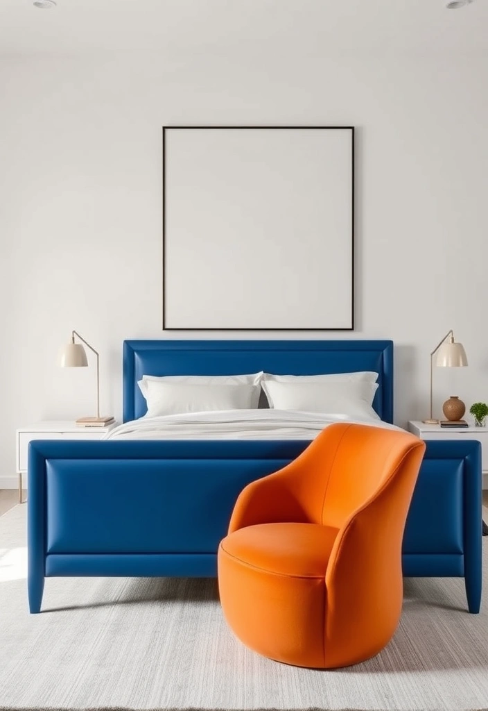 A simple bleu bed frame paired with a striking orange accent chair can create a focal point without overwhelming the space.