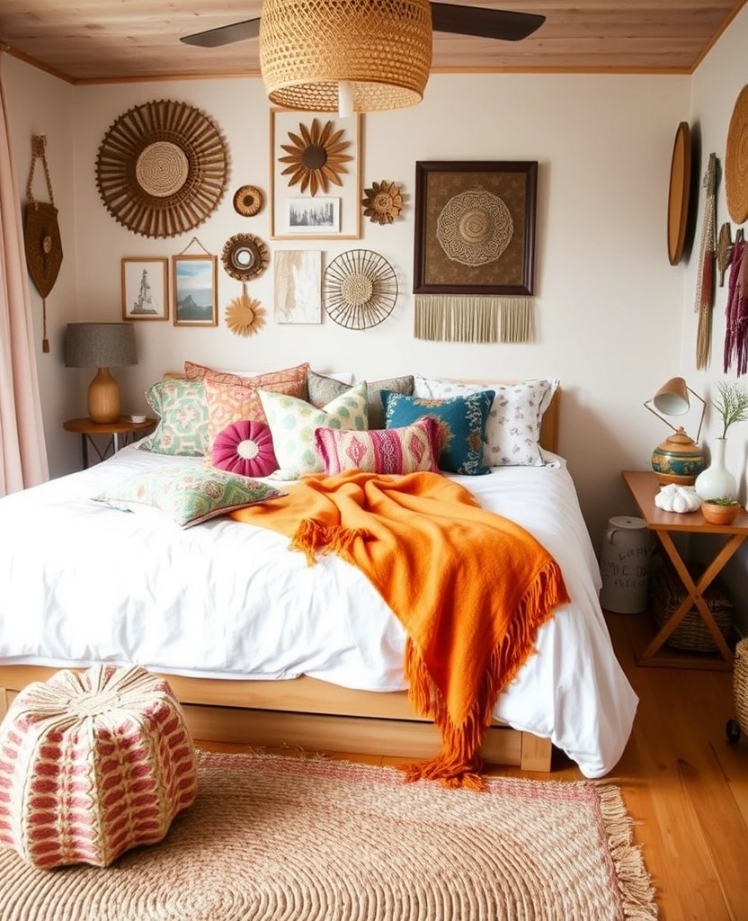 Think of a cozy bed piled high with patterned pillows, a vibrant orange throw blanket, and an eclectic mix of wall hangings.