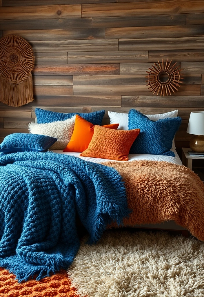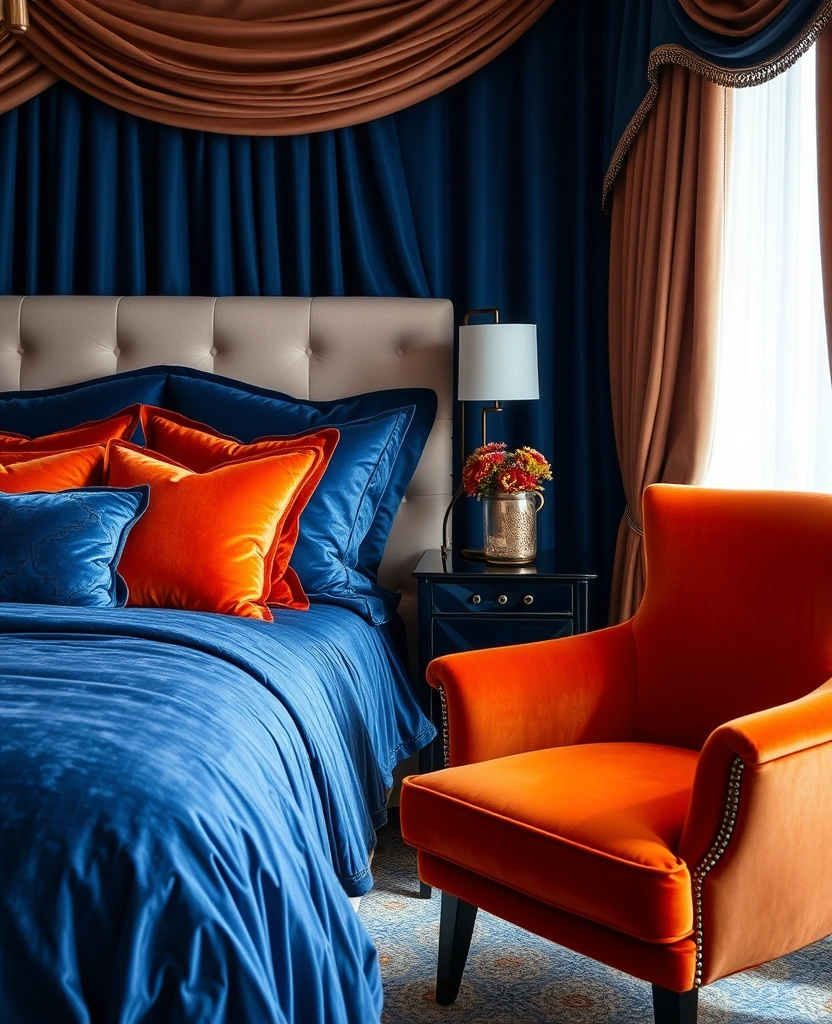 Think plush velvet bedding in deep bleu, complemented by orange velvet accent pillows. Incorporate a velvet armchair in a bold orange hue for a statement piece that invites relaxation.