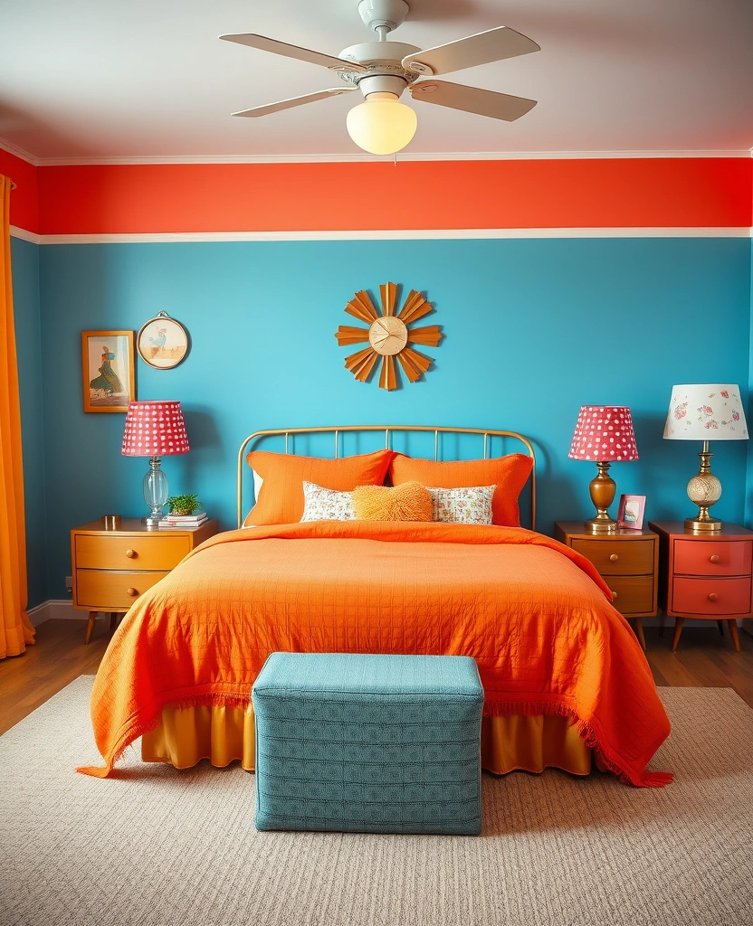 Bring retro vibes to life with a bleu and orange bedroom that showcases fun patterns and nostalgic decor.