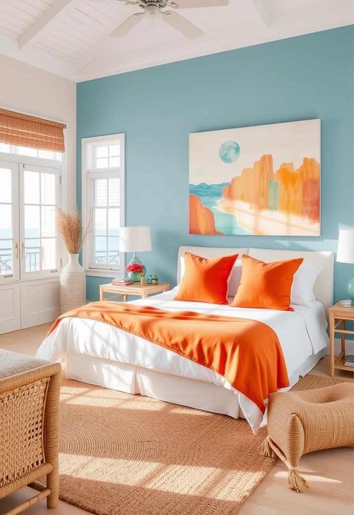 Incorporate natural textures like wicker furniture and soft, white linens to enhance the beachy vibe. A large, abstract painting featuring shades of bleu and orange can serve as a stunning focal point.