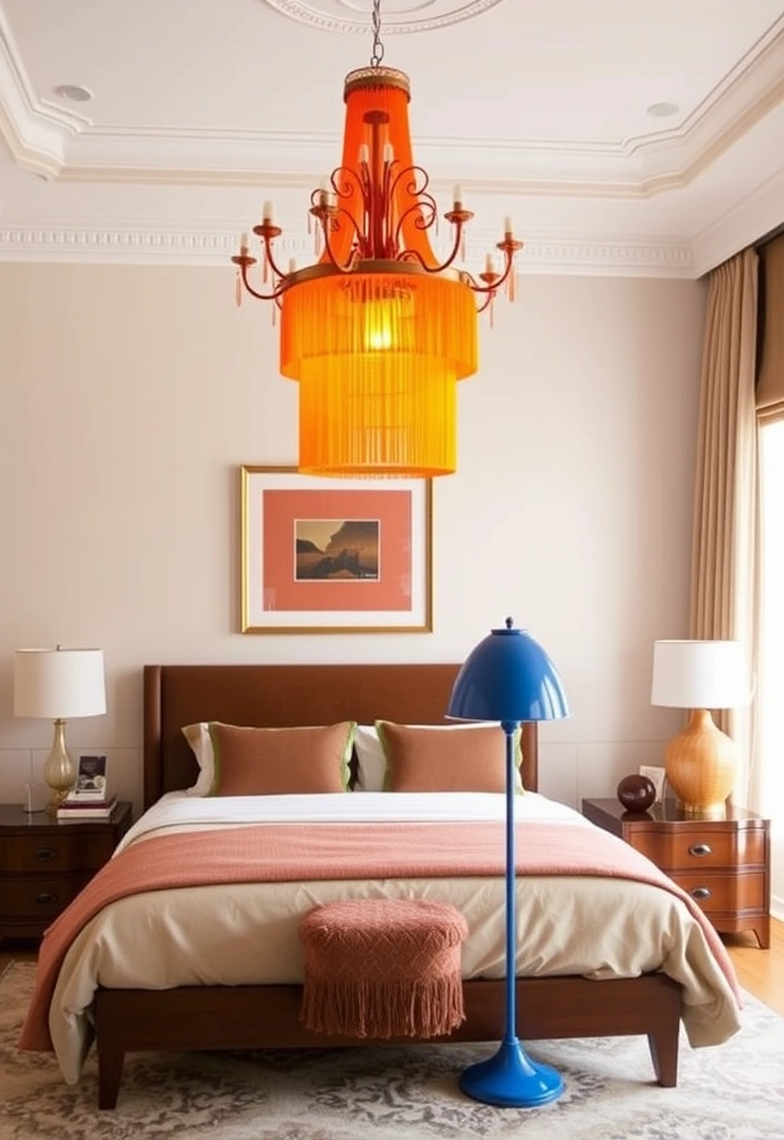 Consider a striking orange chandelier or a unique blue floor lamp that becomes the focal point of the room.
