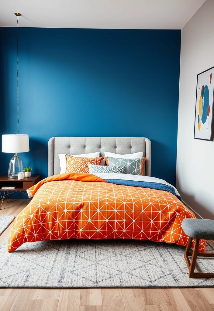 Infuse your bedroom with a contemporary flair by using geometric patterns in blue and orange.