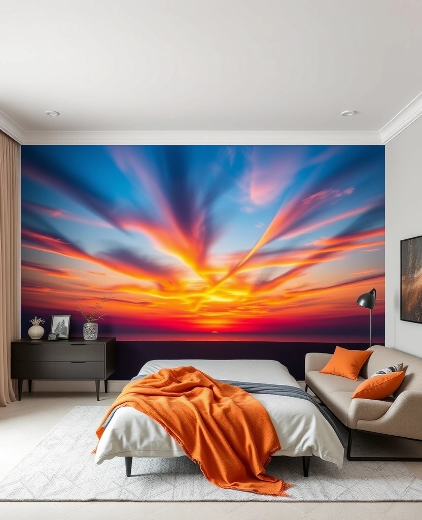 Consider a large mural depicting a sunset over a tranquil sea, where the colors seamlessly blend into your bedroom decor.
