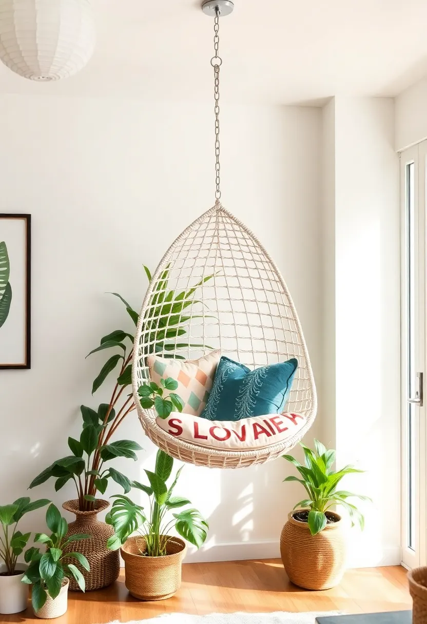 Hanging chairs add a unique and playful element to your living room while saving valuable floor space.