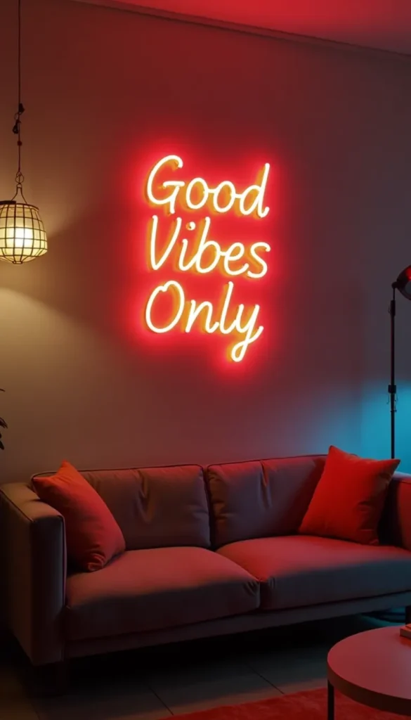 Want to go full Instagrammable? A neon sign adds retro flair and personality. Choose a motivational quote (“Good Vibes Only”), a cheeky phrase (“I’ll Have a Salad”), or a simple shape (hello, crescent moon!).